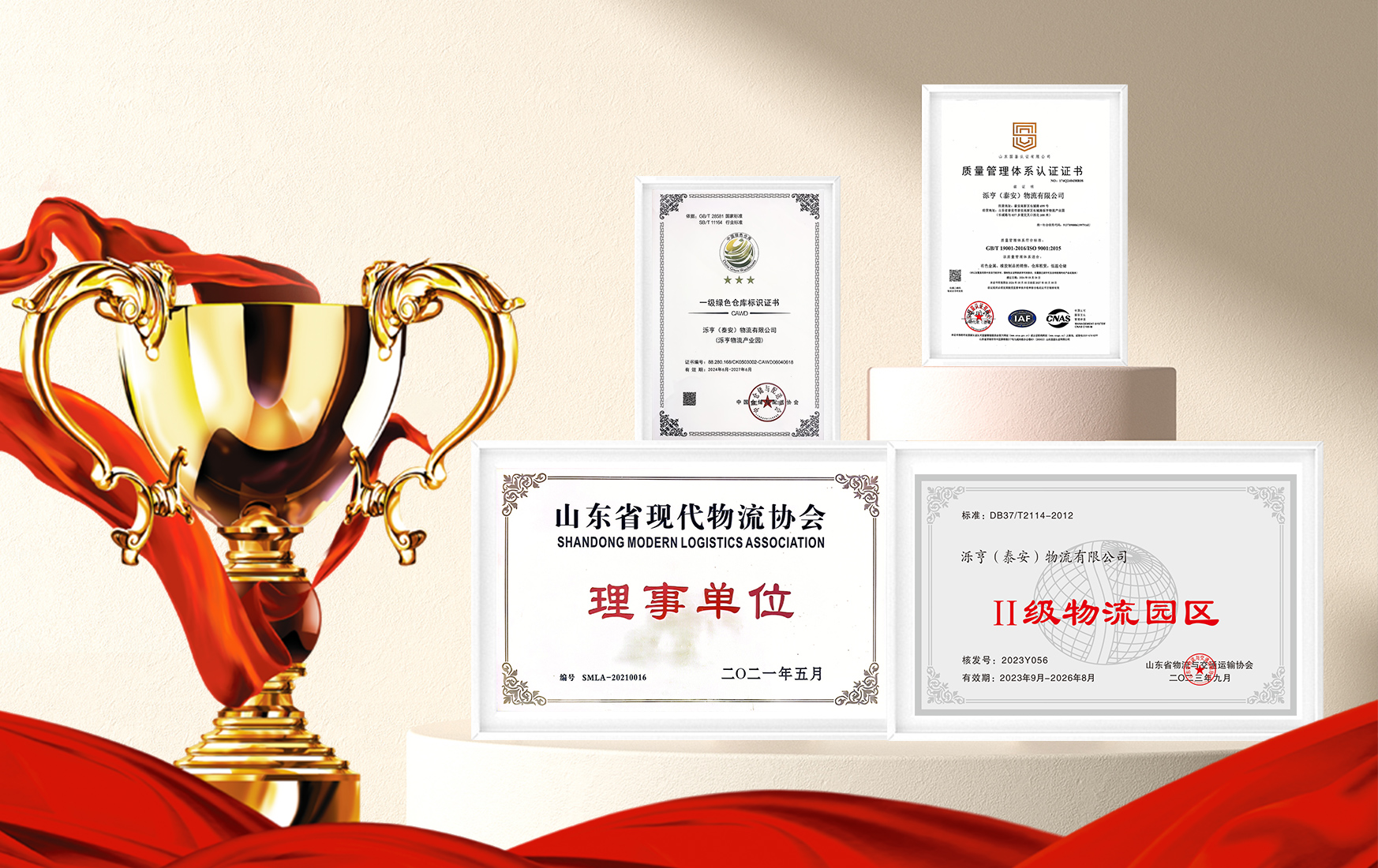 公司通过了ISO9001质量管理体系认证,公司经营的泺亨物流产业园被山东省物流与交通运输协会评选为二级物流园区;被中国仓储与配送协会评定为“一级(⭐⭐⭐)绿色仓库”,是中关村绿色冷链物流产业联盟团体会员、中冷联盟会员、山东省物流与交通运输协会副会长单位、山东省现代物流协会理事单位。